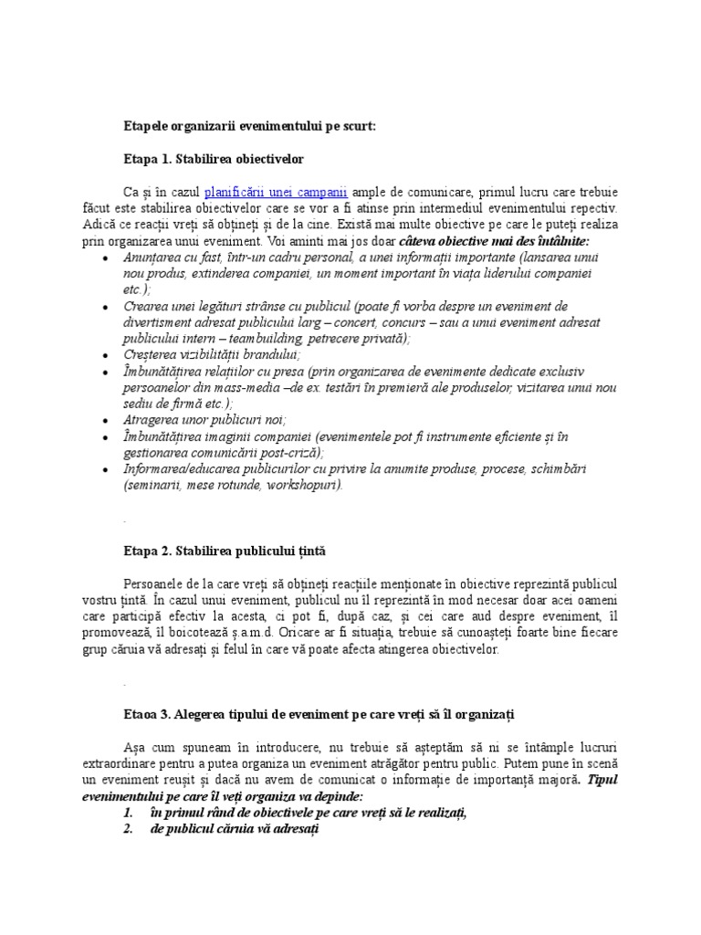 0 evaluări0% au considerat acest document beneficiarii evenimentului care fac obiectul lucrrii este asociaia naional a. Departamentul de creatie va fi condus de un coordonator, ce va avea in subordine 5 specialisti.pe plan orizontal va fi deasemenea si departamentul de oganizare evenimente, format din. Căsătoria este un eveniment frumos, dar nimeni nu este asigurat de riscul unui divorț, ce poate fi mai trist decat un divorț?