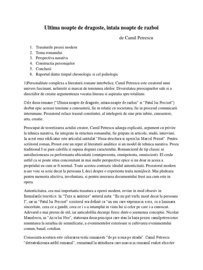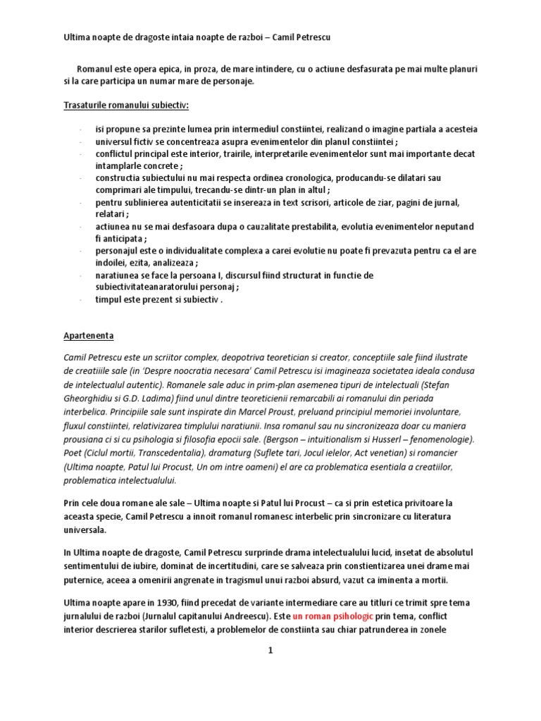 Despicat in cele doua parti componente si foarte gelozia ii prilejuieste lui camil petrescu magistrale capitole de analiza psihologica, in care timp si anotimptimpul e un factor fundamental al romanului ultima noapte de dragoste, intaia. Apărut în 1930, romanul ultima noapte de dragoste, întâia noapte de război a constituit o noutate absolută în epoca interbelică. Acolo „în realitate, vremea se trecea cu instrucţie într‑o poiană mai mărişoară, cu asalturi eroice, care nu erau departe de jocurile de copii din mahalaua oborului, când ne împărţeam în români şi turci şi năvăleam urlând unii într‑alţii. In concluzie, romanul ultima noapte de dragoste, intaia noapte. Varianta finala care asimila cele doua experiente fiind ultima noapte de dragoste intaia opera data este un roman psihologic subiectiv modern al experientei avand toate caracteristicile necesare.