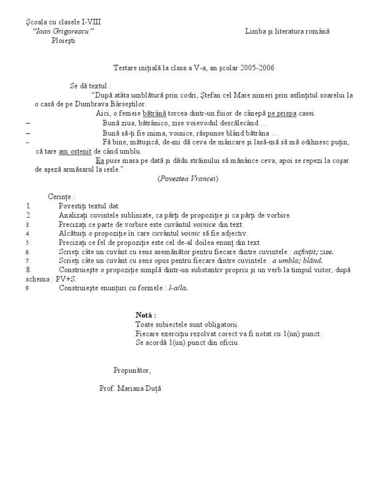 Test Initial Clasa 5 Romana / Clasa A V A Docshare Tips. Test de evaluare iniţială limba și literatura română clasa a. Pentru rezolvarea corect a tuturor . Page 1 of 5 școala gimnazială dorna arini obiectul: Aria curriculara limba si comunicare: Limba şi literatura română profesor: